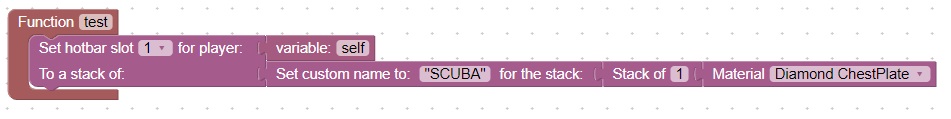 This code will create a diamond chestplate with the custom name: "SCUBA" and place it in the players hotbar