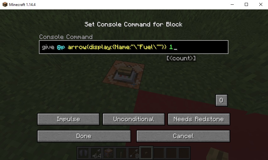 give @p arrow{display:{Name:"\"Fuel\""}} 1