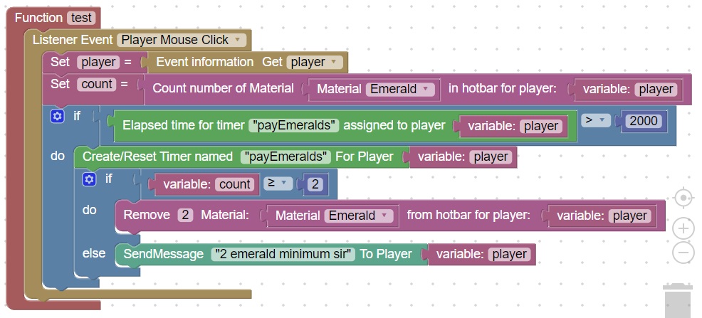 Here is a sample code that counts the number of emeralds and reduces them by 2 in the hotbar: